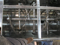 1.機槽為U形體,采用不銹鋼制造,內(nèi)裝攪拌槳葉,橫臥在塑料臥式攪拌機的減速器與倒料減速器上.
